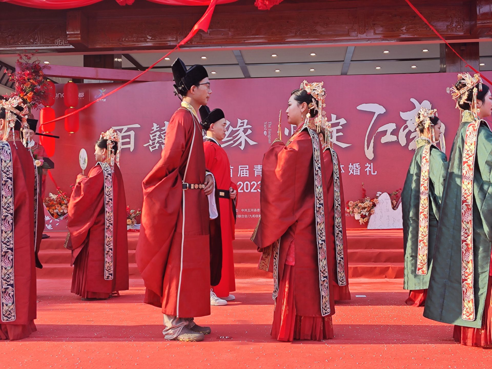 撒五谷、却扇礼、合卺礼、新人沃盥……七夕当日,一场古色古香、浪漫又独具中华传统文化特色的集体婚礼在五河县江南院子举行。活动现场处处可见传统婚俗布置和中国红元素,显得格外喜庆。15对新人身着传统中式婚服,伴随着古乐,逐对携手开启幸福人生。