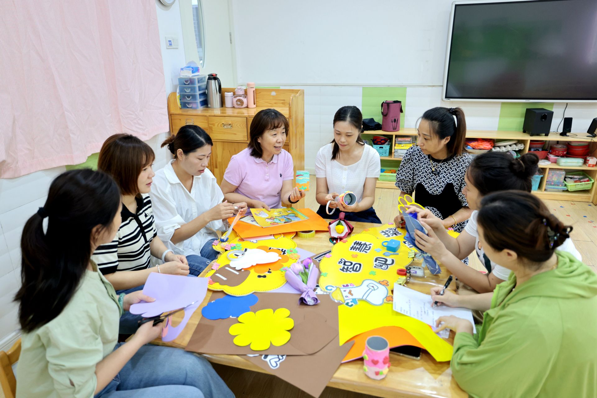 月28日,蚌山幼儿园紫荆分园,老师们进行手工制作,准备布置教室。