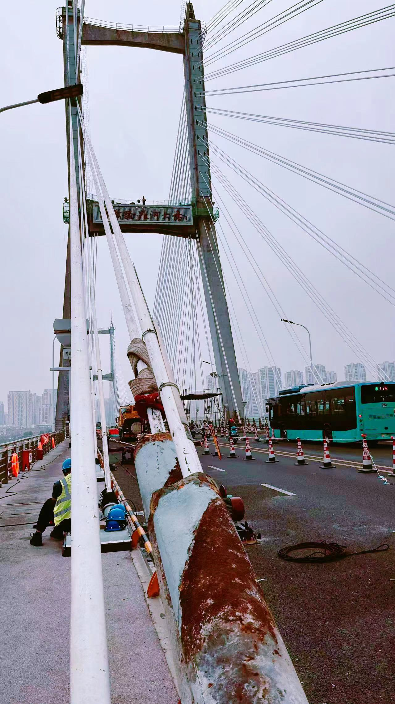 考虑到大桥斜拉索已服役34年,已超过最低设计使用年限,为综合评判既有斜拉索的健康状况,市公路管理服务中心综合拉索历史病害、技术状况、规格型号等因素,选取具有代表性的6根斜拉索,开展试验性更换。
