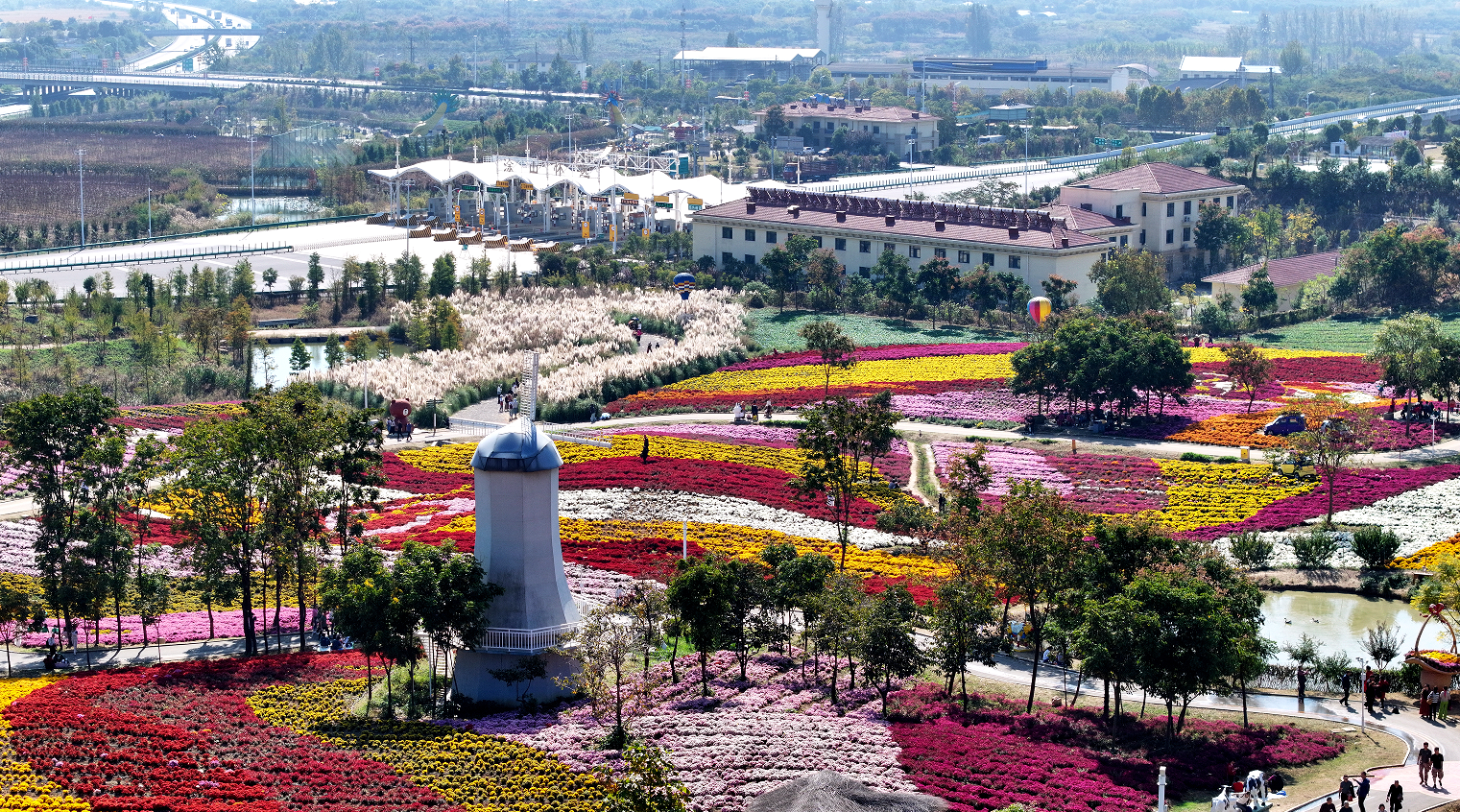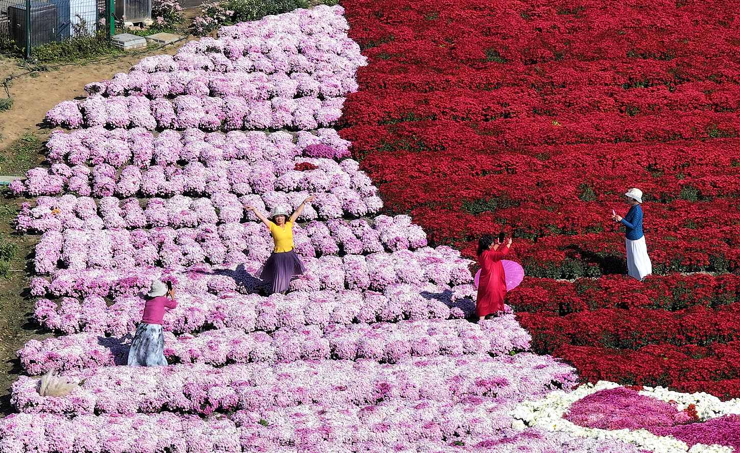 百亩菊花蔚然绽放,宛如一片浩瀚的花海。粉黛乱子草与金黄、雪白、鹅黄、紫红等各色菊花相映成趣,像打碎的调色板般五彩绚丽。周边农田,村舍,楼宇俨然,草木青绿,徜徉其中让人流连忘返。(融媒体记者 陈昂 文图)