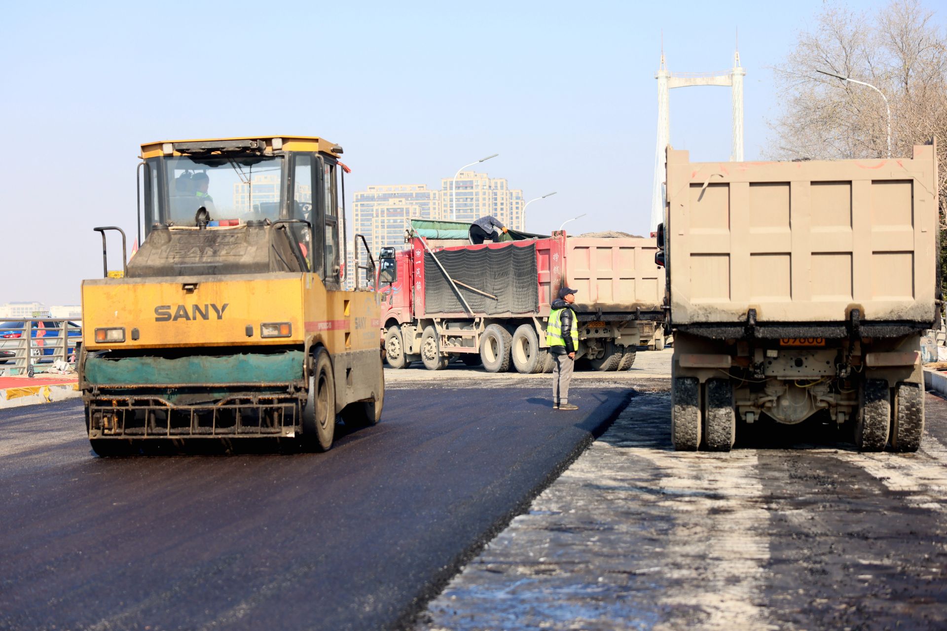 该项目系滨河南路(解放一路-新城路)道路工程重要施工内容之一,由市重点工程建设管理中心组织建设,施工单位为安徽中旭环境建设有限责任公司。据施工单位项目生产经理常云飞介绍,现正在桥面沥青摊铺,按照目前施工进度,26日开始施划交通标线,27日下午桥面机动车道通车放行。(融媒体记者 刘晨摄)