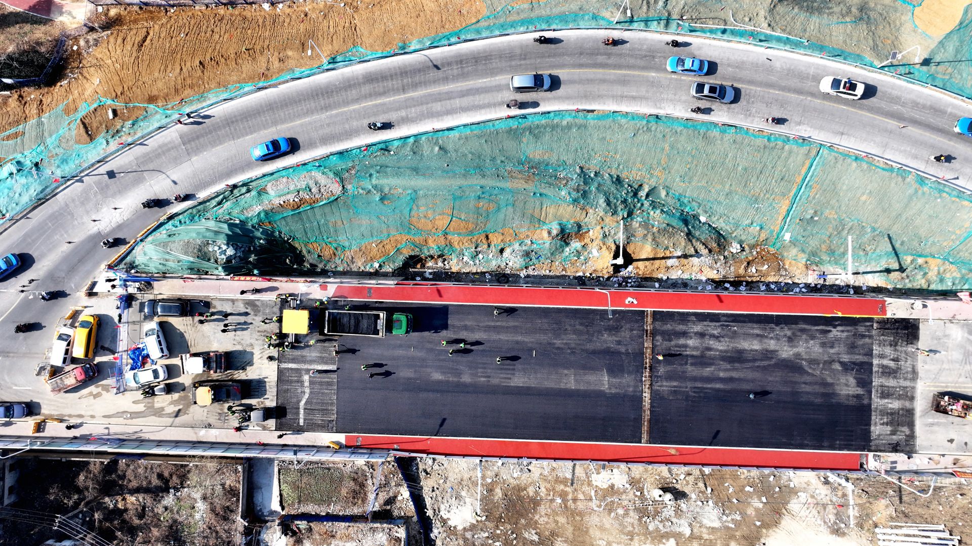 蚌埠发布客户端讯 12月25日,蚌报融媒体记者来到解放路淮河大桥下,沿着临时辅路探访南侧施工区域,看到桥面摊铺沥青初见效果,现场工人和大型工程机械车辆正抢抓有利天气进行联合施工。
