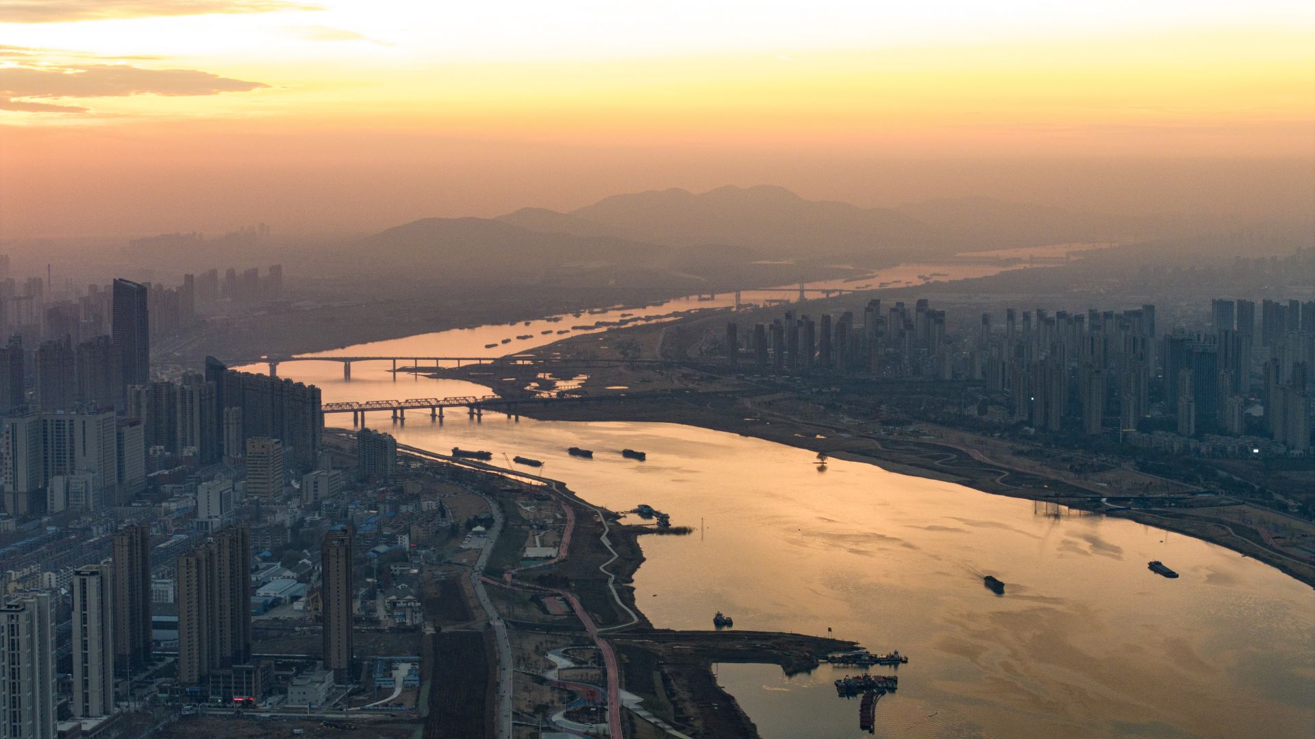 12月26日,冬日的寒风虽冷,却无法抵挡人们欣赏美景的心情,珠城晚霞映照淮河两岸,将靓淮河染成了一片金红色,呈现出一幅美丽的画卷。