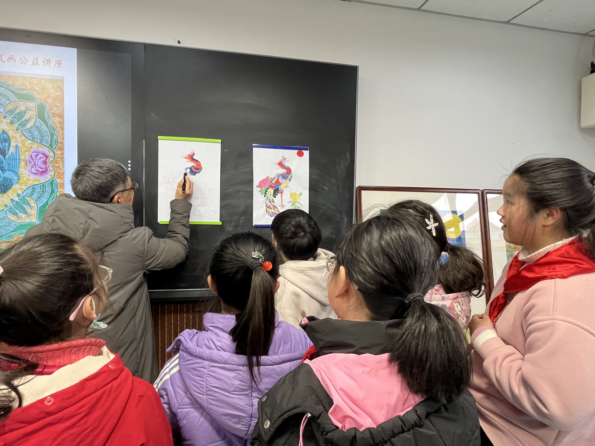参加讲座的师生50余人。薛传江介绍了凤画的产生和发展,并现场展示了十余幅作品,让孩子们近距离感受凤画魅力。课堂上薛传江结合电子课件和画稿,还现场指导师生绘画、上色,对凤画的绘画技巧边讲解边指导学生们实操,课堂气氛十分活跃。
