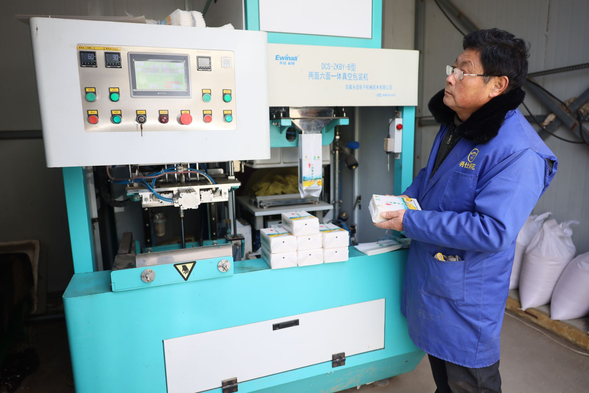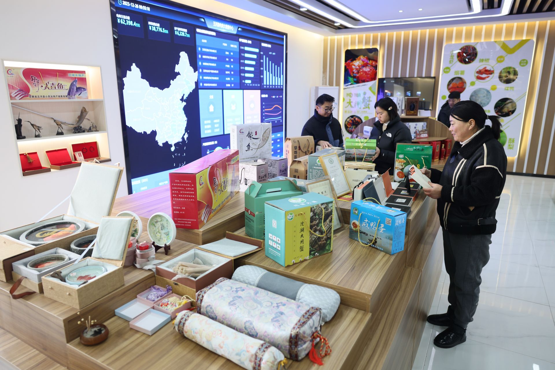日前,游客在位于浍河村的沱湖电商公共服务中心选购五河特产。