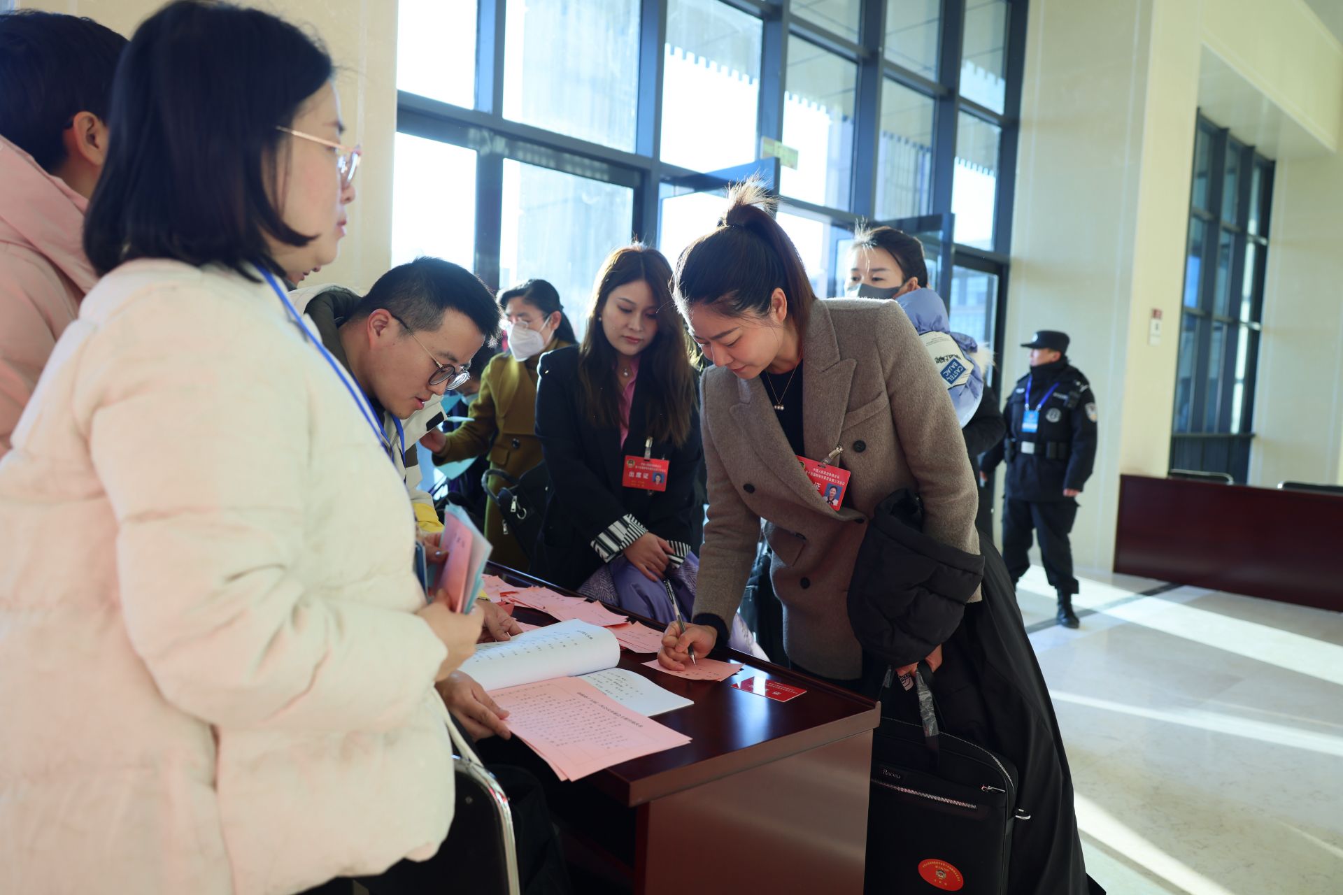 1月15日上午,出席市政协十五届三次会议的政协委员在会场入口处签到。