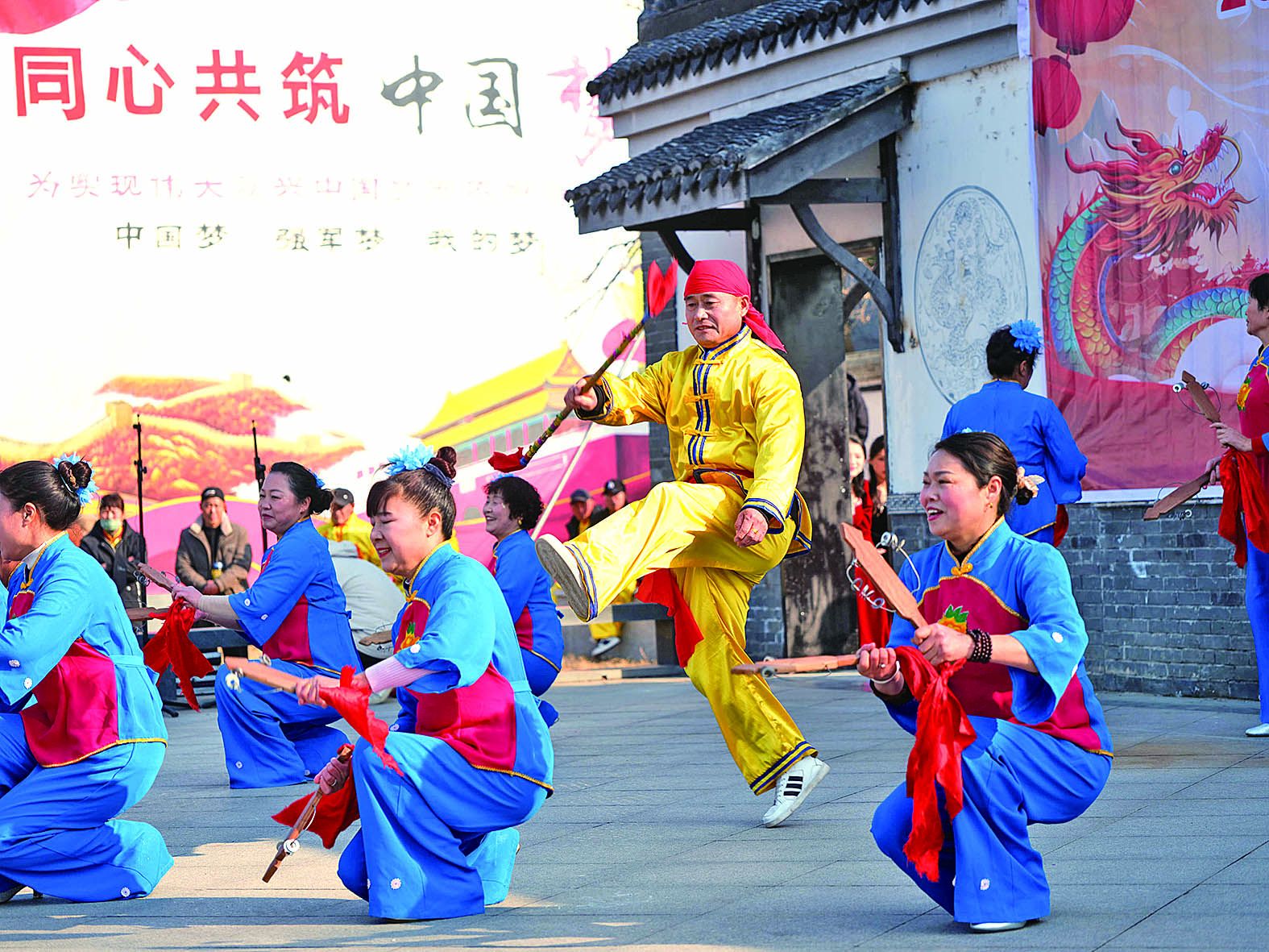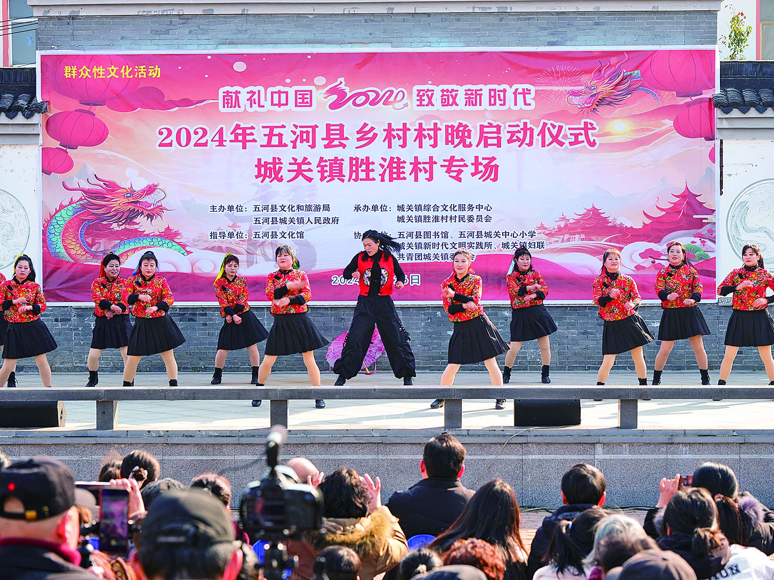 锣鼓喧天,歌舞飞扬。1月26日,2024年五河县乡村村晚城关镇胜淮村专场欢乐开演,村民自编自演的节目吸引众多乡邻驻足观看。