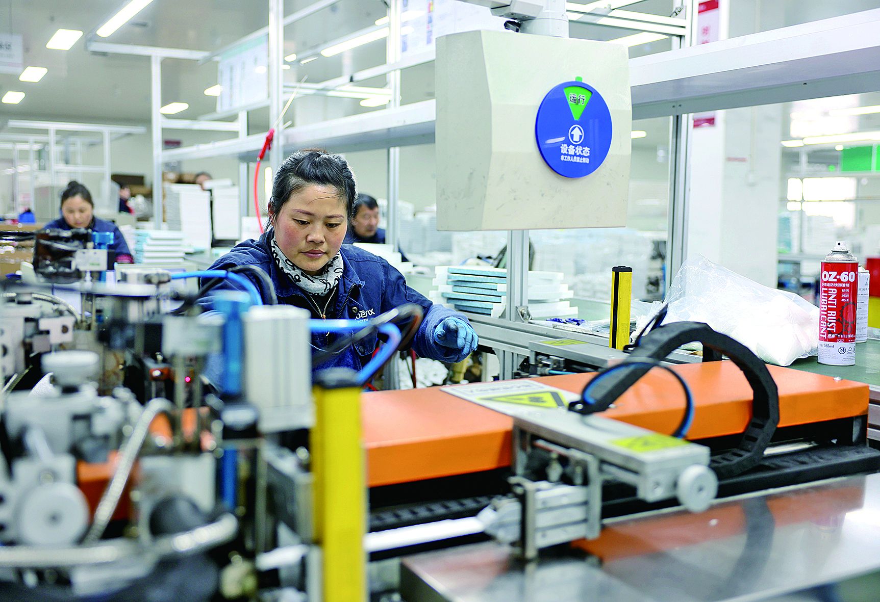 蚌埠国显科技有限公司生产车间,技术人员查看设备运转情况。