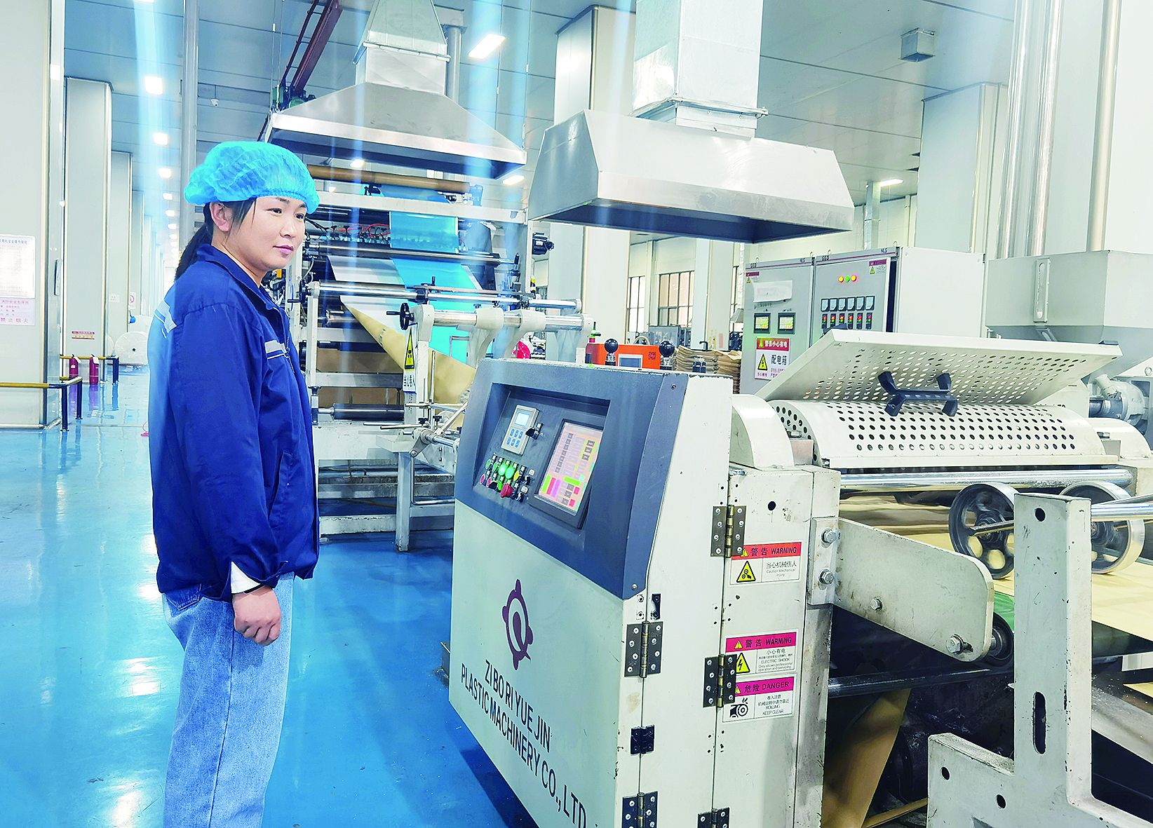 蚌埠天成包装科技股份有限公司生产车间,工人检查机械设备运行情况。