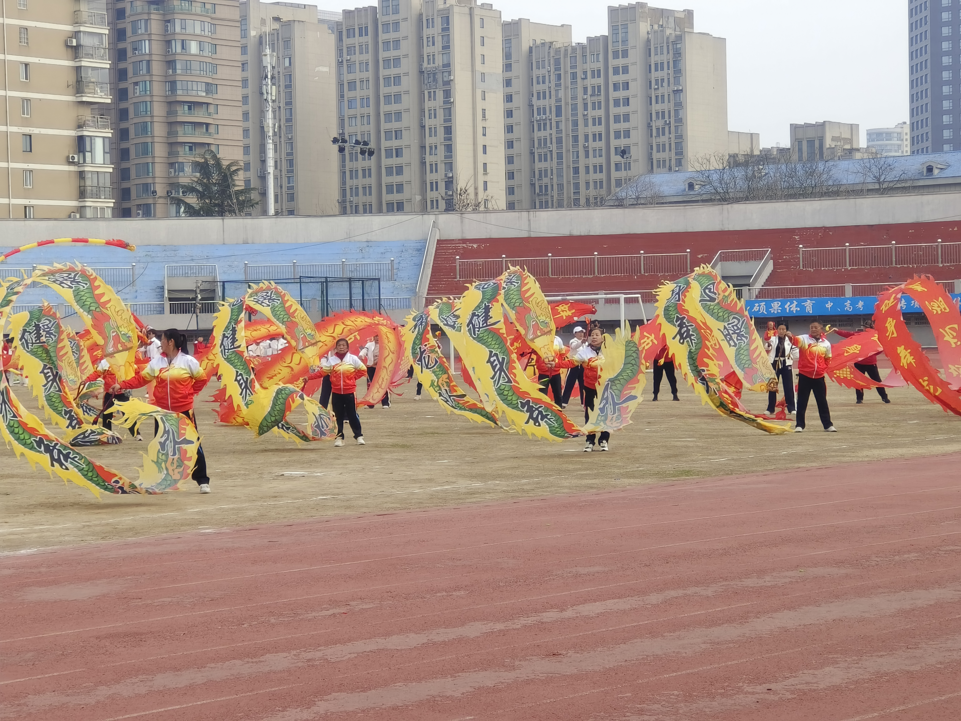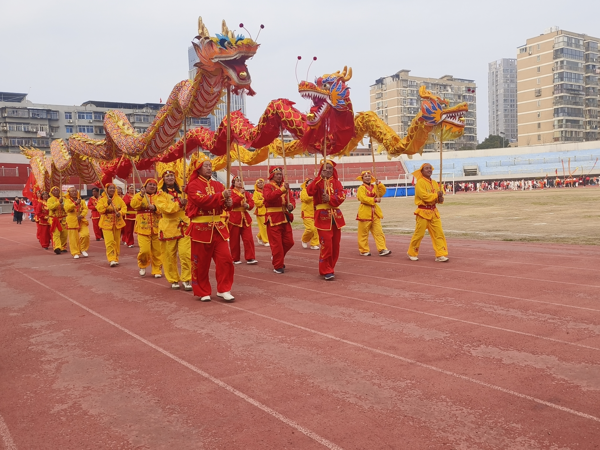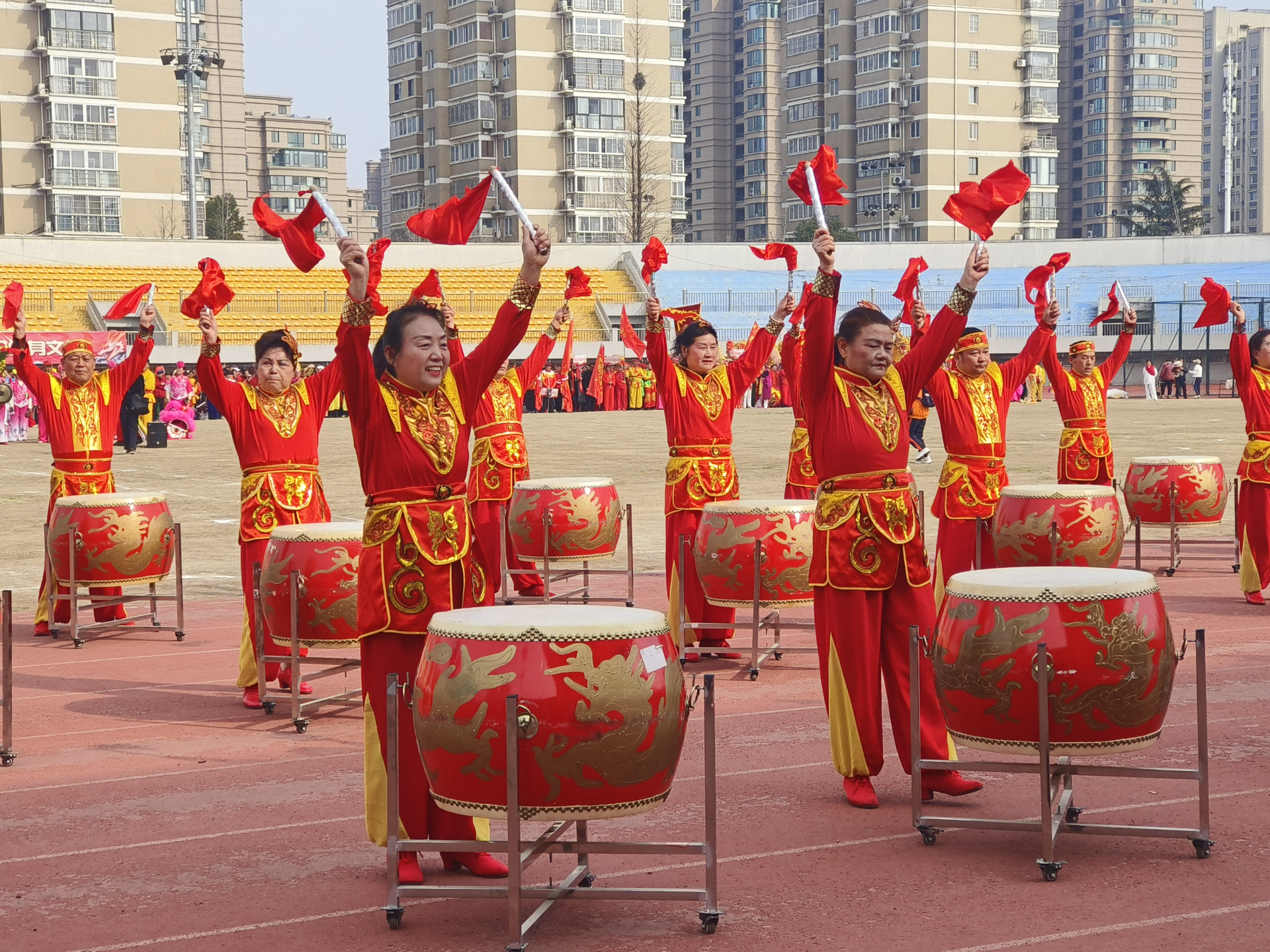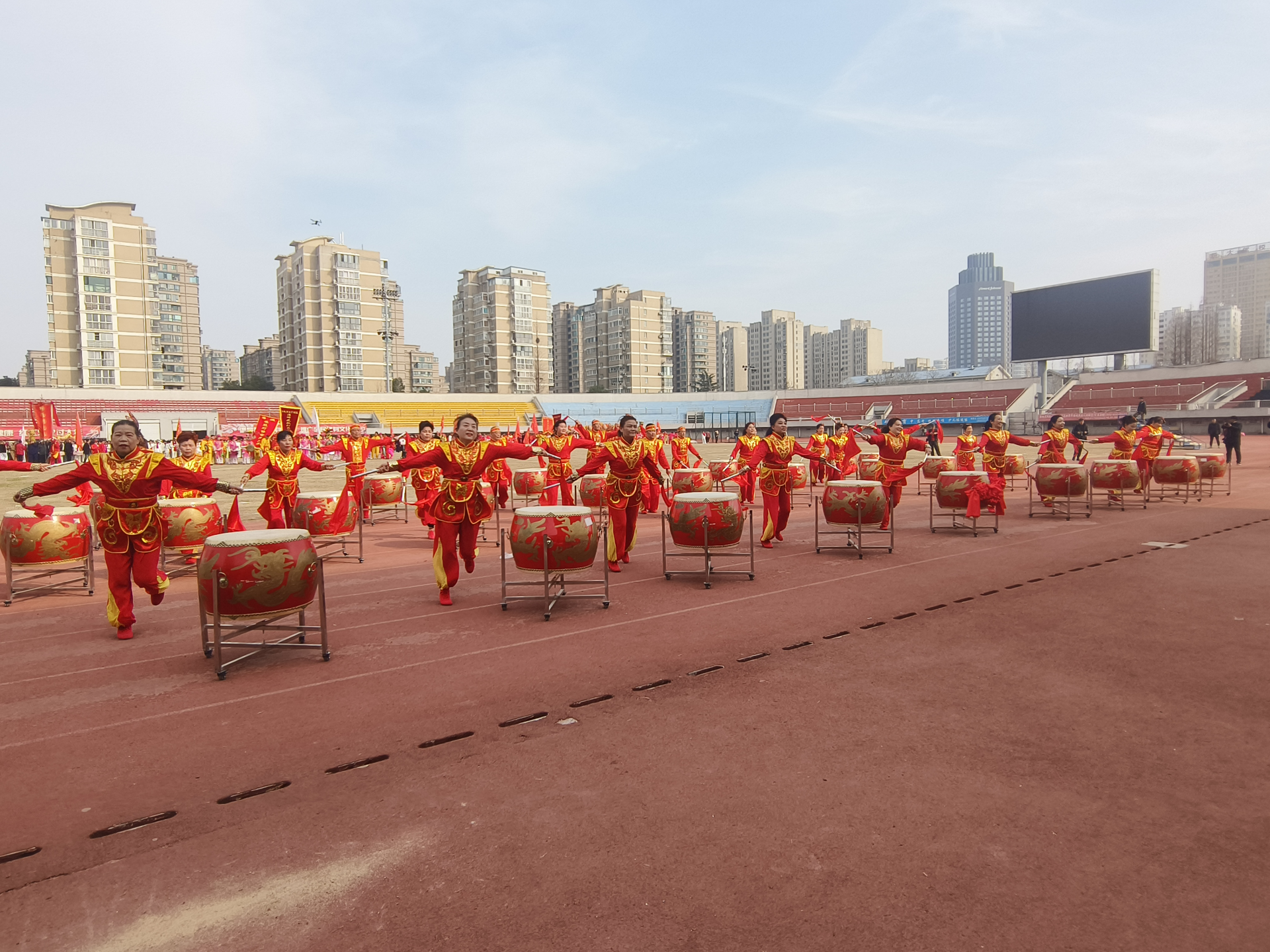 当天下午,市体育场内鼓乐喧天,热闹非凡,蚌埠市2024年“二月二龙抬头”全市群众体育民俗展示暨大型踩街活动举行。伴随着欢快喜庆的锣鼓声,《江淮鼓韵》气势恢宏地“唤醒”了春天。一场《龙腾狮舞庆新年》的花鼓灯表演热闹暖场,民俗表演接连上演,精彩纷呈。