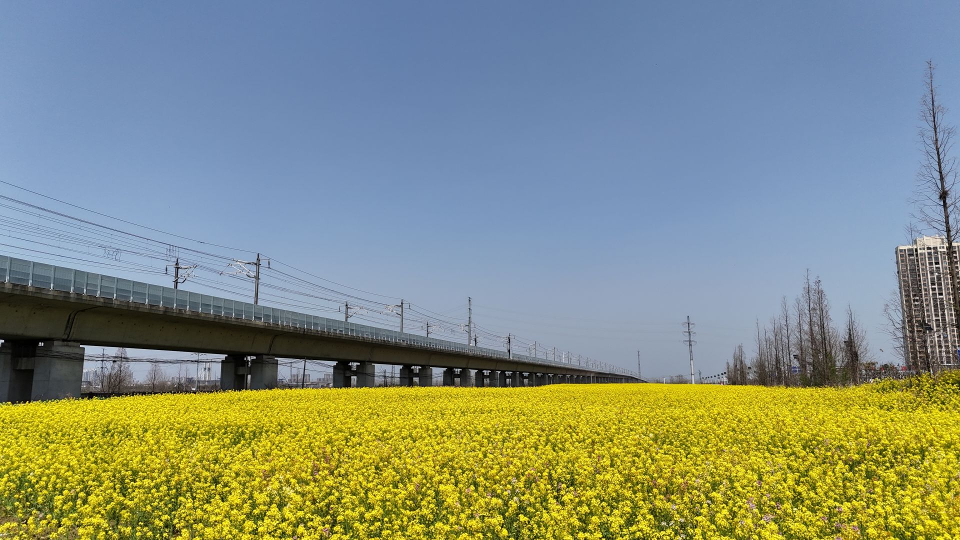 近日,在蚌埠经开区长淮卫镇的高铁沿线区域,成片的油菜花海构成了一幅美丽的田园风光,与飞驰的高铁相映成景。