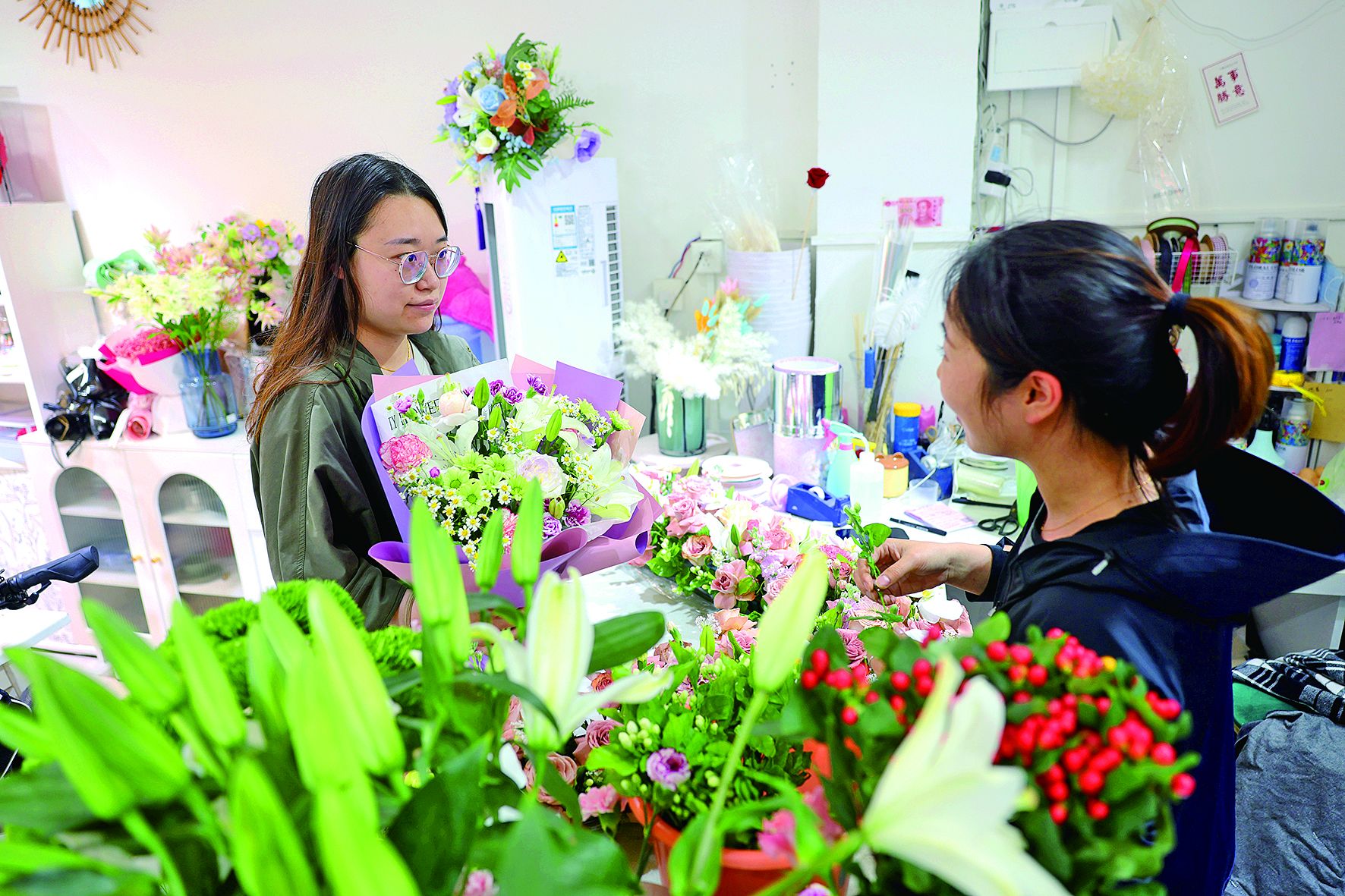 母亲节将至,市民李雪珺为母亲提前订购鲜花。
