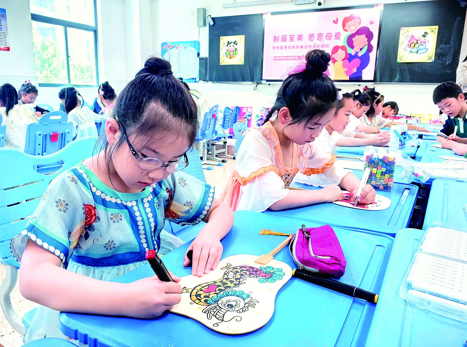 5月8日,蚌埠市秀水实验学校年画艺术工坊开展“‘制扇’至美 感恩母爱”活动,孩子们在扇子上绘制美丽的图案,送给妈妈表达节日祝福。