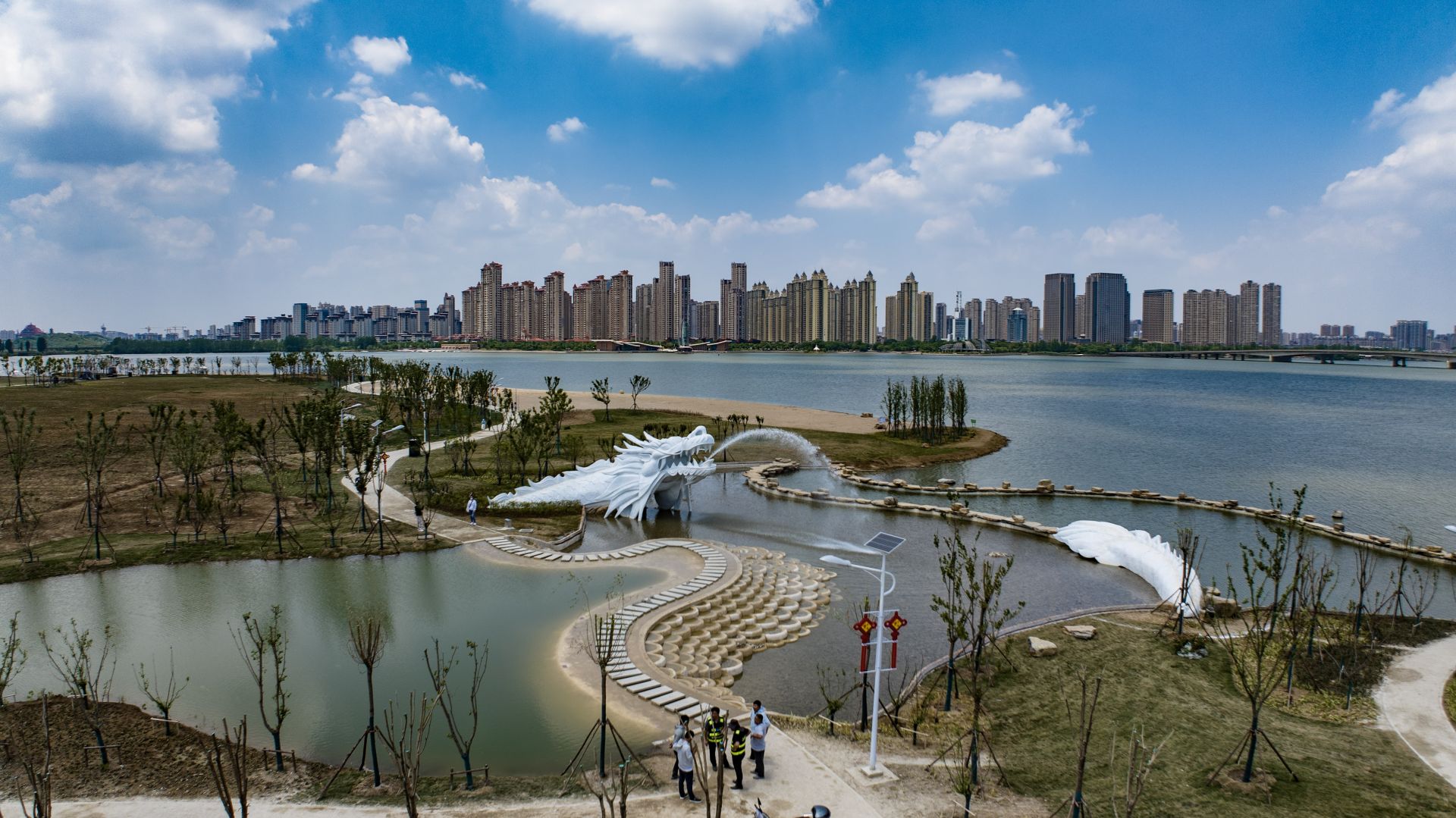 5月22日,记者在该项目现场看到,一条巨大的白龙雕塑气势恢宏,龙头前喷射出巨大水柱,如同瀑布一样壮观,龙身嵌入水池中,龙鳞栩栩如生,龙尾仿佛从地下甩出。在无人机的视野下,白龙成为龙子湖的点睛之笔,与远处龙子湖大桥交相辉映,美不胜收!