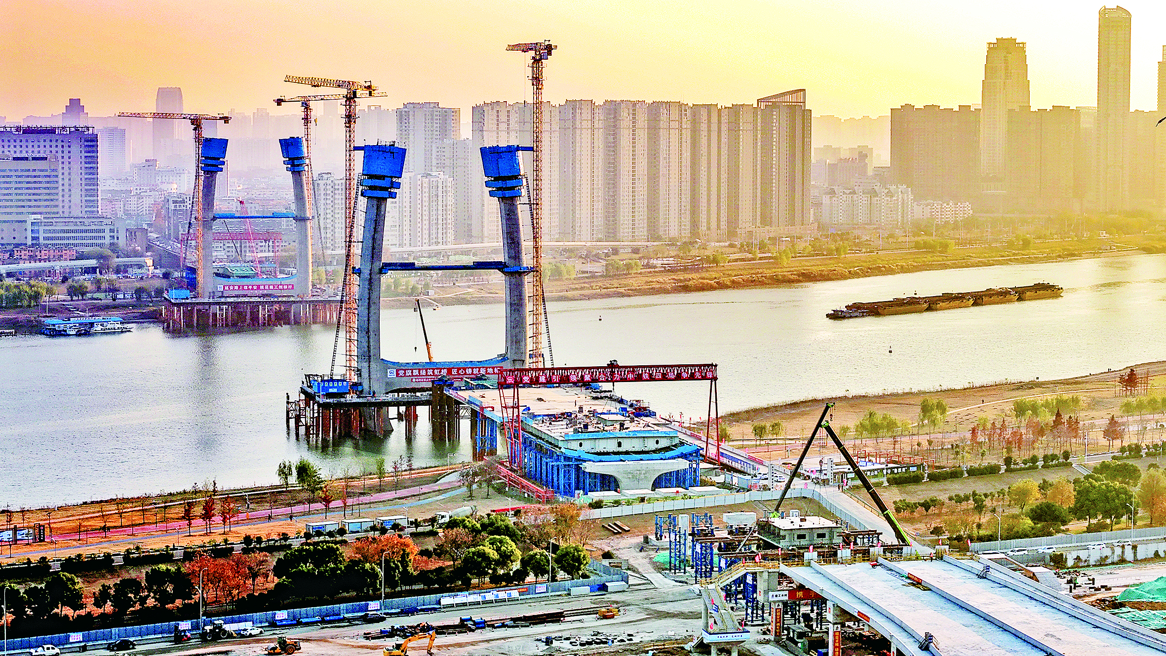 日前,延安路淮河大桥及接线工程项目北岸引桥最后一段箱梁——滨河北路段钢箱梁正式启动吊装作业。据安徽建工水利延安路淮河大桥项目桥梁施工负责人王真介绍,他们将会做好冬季施工保障措施,加班加点进行吊装、焊接及顶推作业,力争在春节前全联架设完成,实现北岸桥梁全部贯通的阶段目标。 (记者 刘晨 摄)