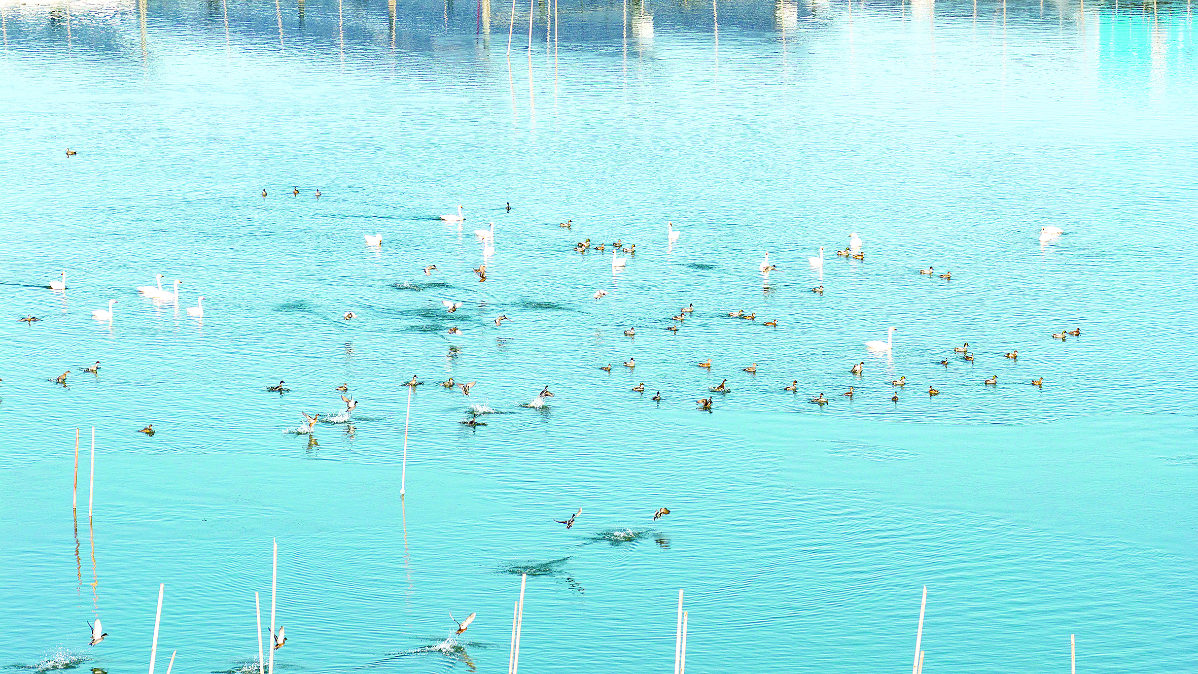 近日,成群的大白天鹅和黑天鹅、斑头雁等越冬候鸟齐聚五河县天井湖游弋、觅食、栖息,美丽的身影倒映在波光粼粼的水面上,与周边的风景交相辉映,勾勒出一幅生机勃勃的生态画卷。 (通讯员 李向前 摄)