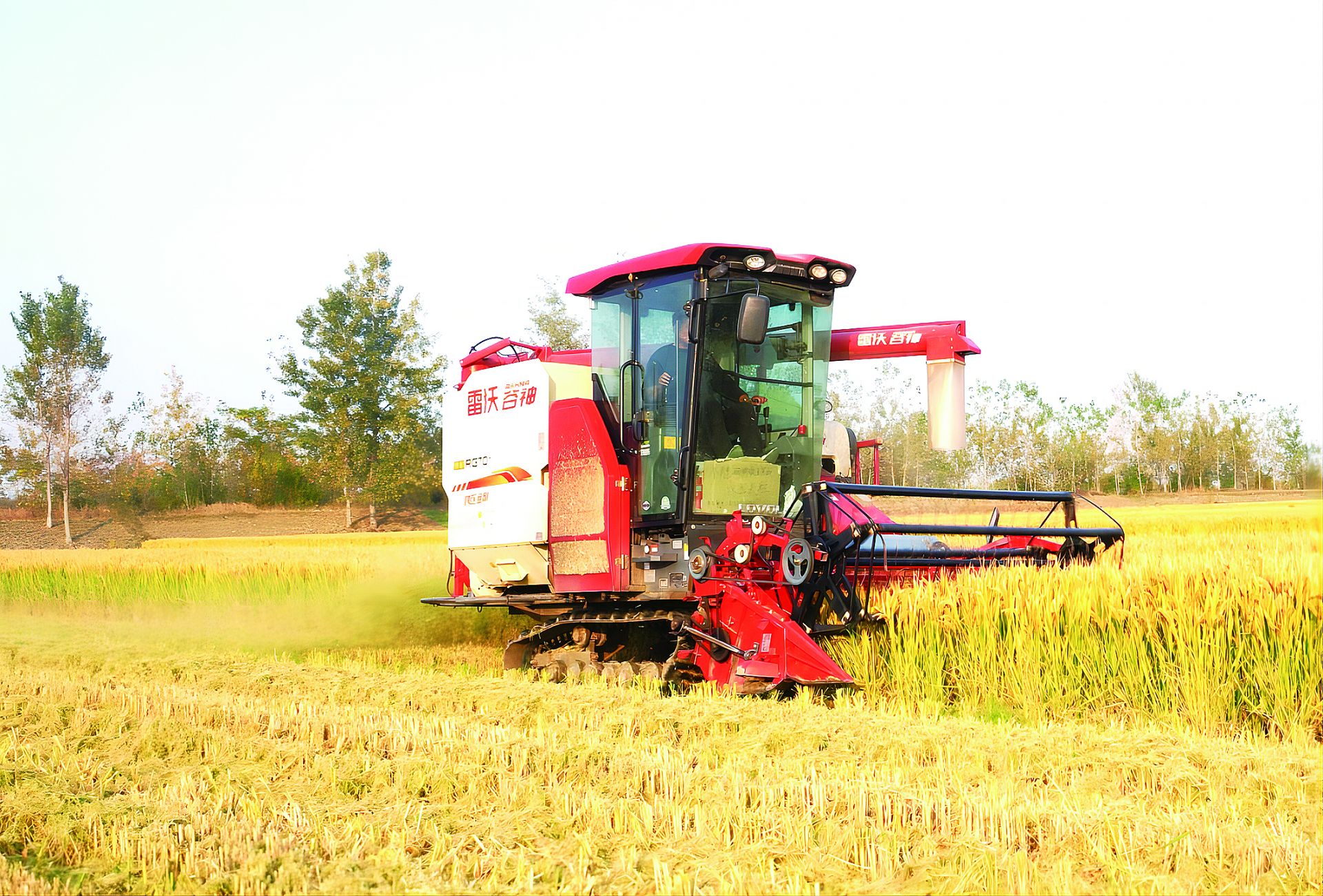 图为农机手驾驶带有秸秆粉碎装置的联合收割机实施粳糯稻收割和秸秆粉碎抛撒还田作业。