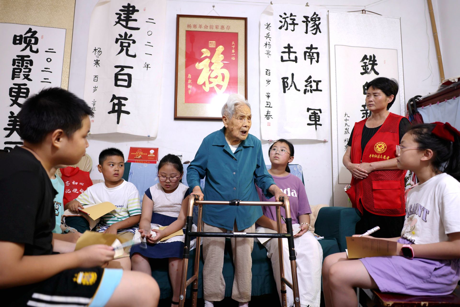 学童听百岁新四军老战士讲述早年战斗故事