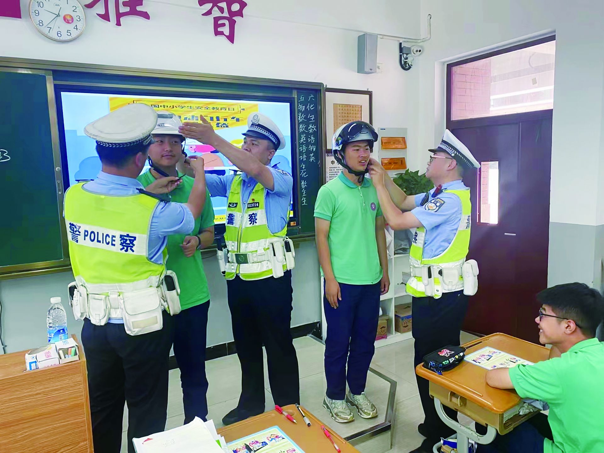 民警们通过酒精检测仪体验、正确佩戴头盔等活动,把同学们学习交通法规的兴趣和积极性推向高潮。