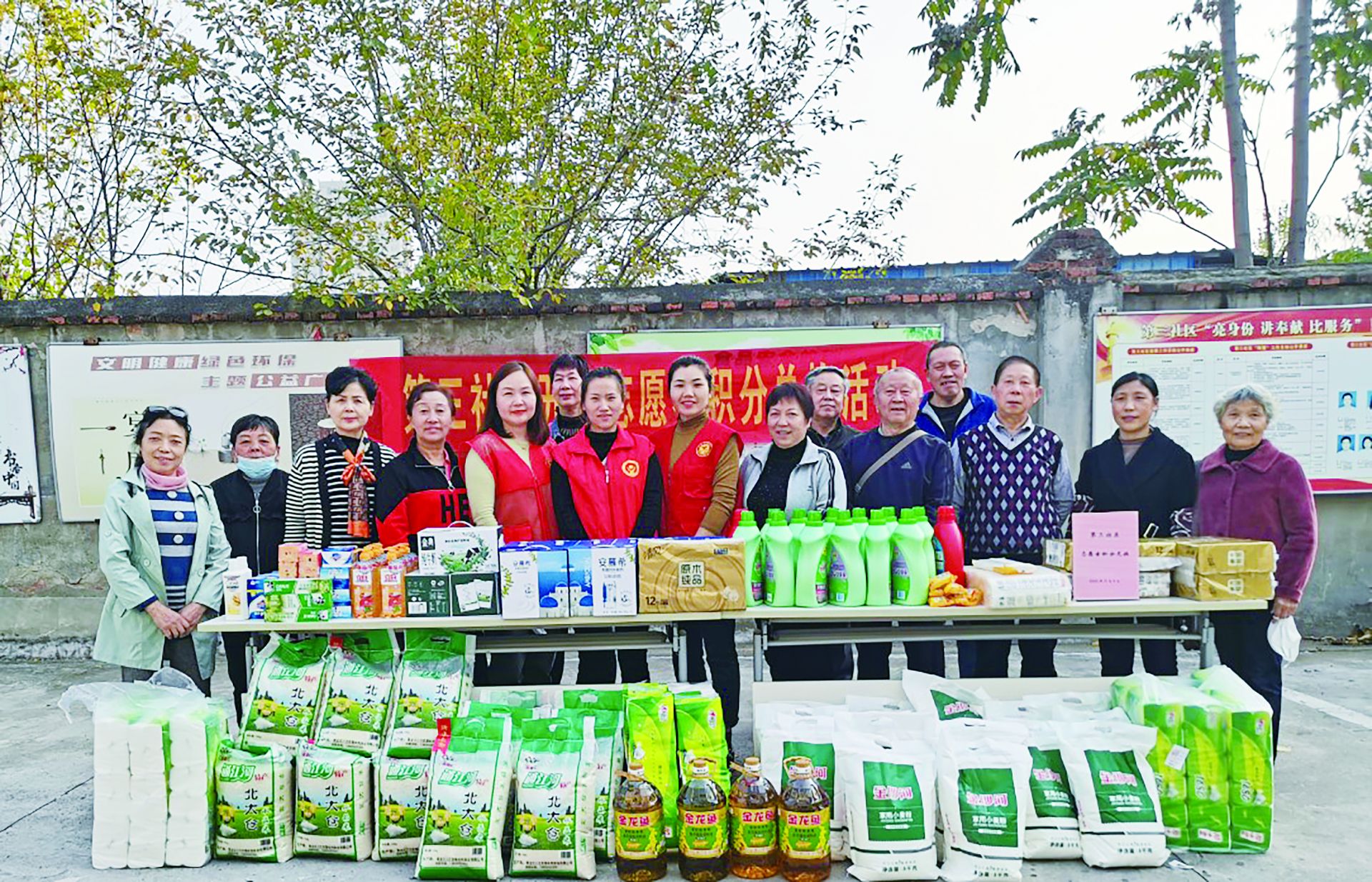 爱心积分兑换活动现场,志愿者根据参加社区志愿服务所累积的志愿服务积分,自由挑选与积分相对应的物品。