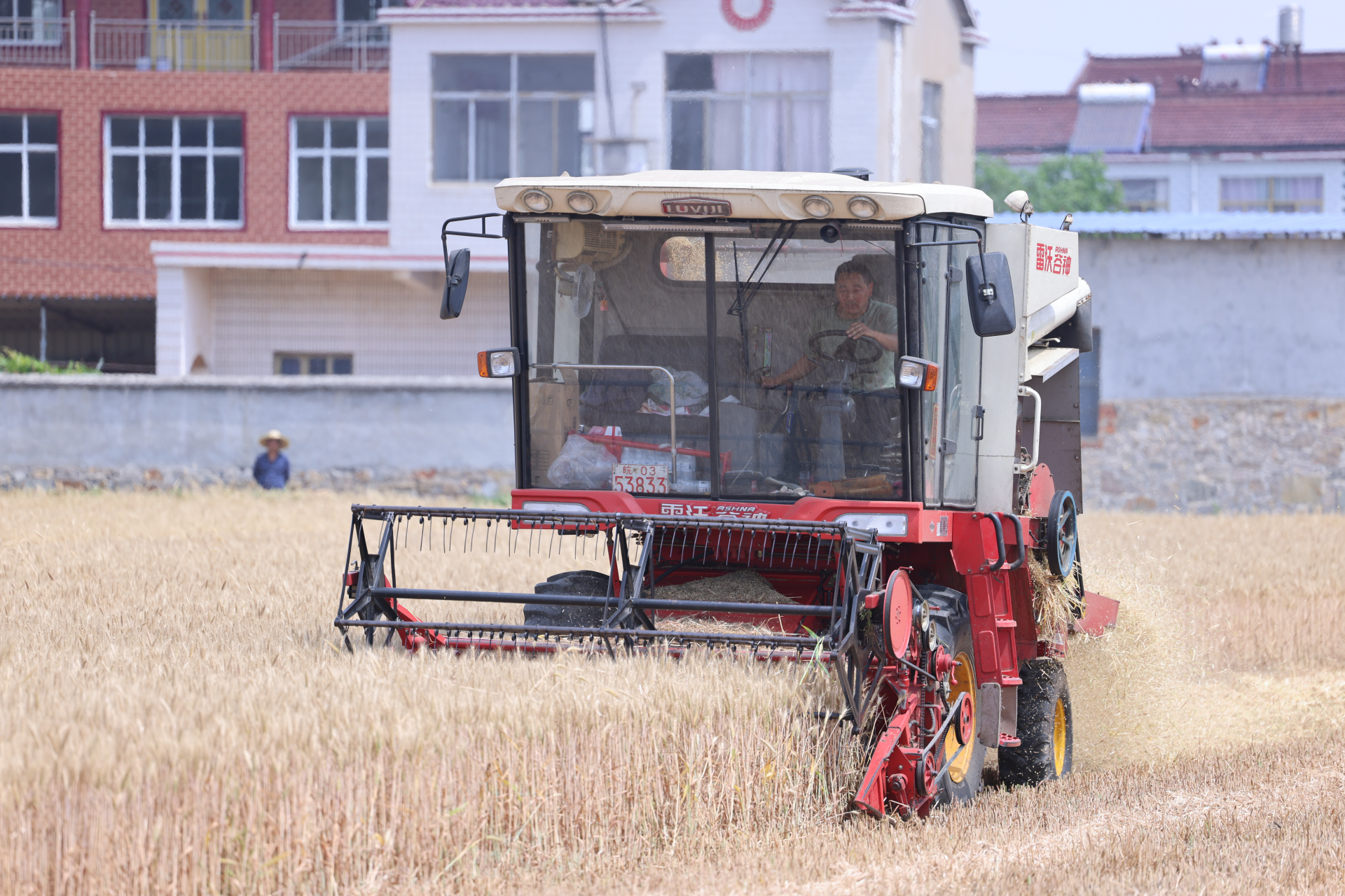 记者在该镇黄郢村看到,收割机在麦田里忙碌不已,每隔一段时间,就会将收获的小麦倒入三轮车内,清空收割机粮仓后继续收割,不放过田间地头每一片麦田。