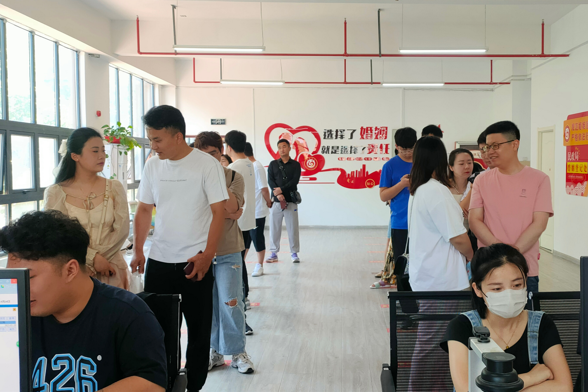 今天上午,记者来到我市龙子湖区婚姻登记处,准新人们为了领取结婚证书已排起“花式”长龙,脸上也洋溢着幸福的笑容,一位女新人更是穿着婚纱前来领证,仪式感满满。
