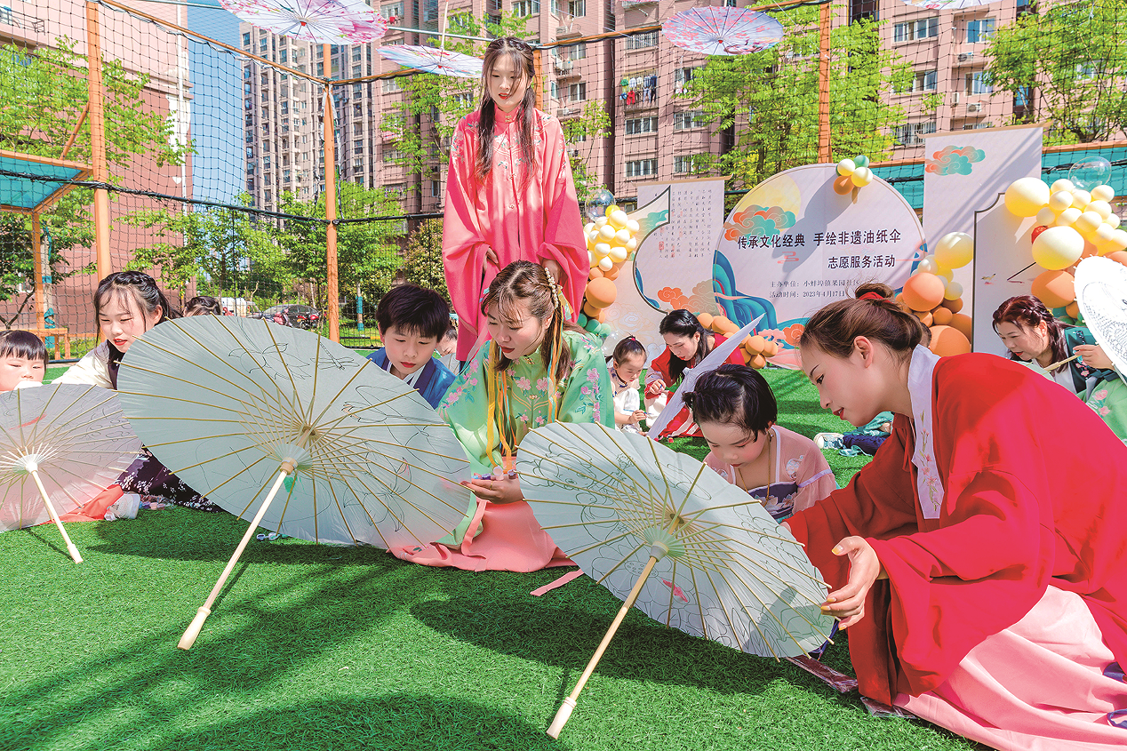非遗进社区 绘制油纸伞