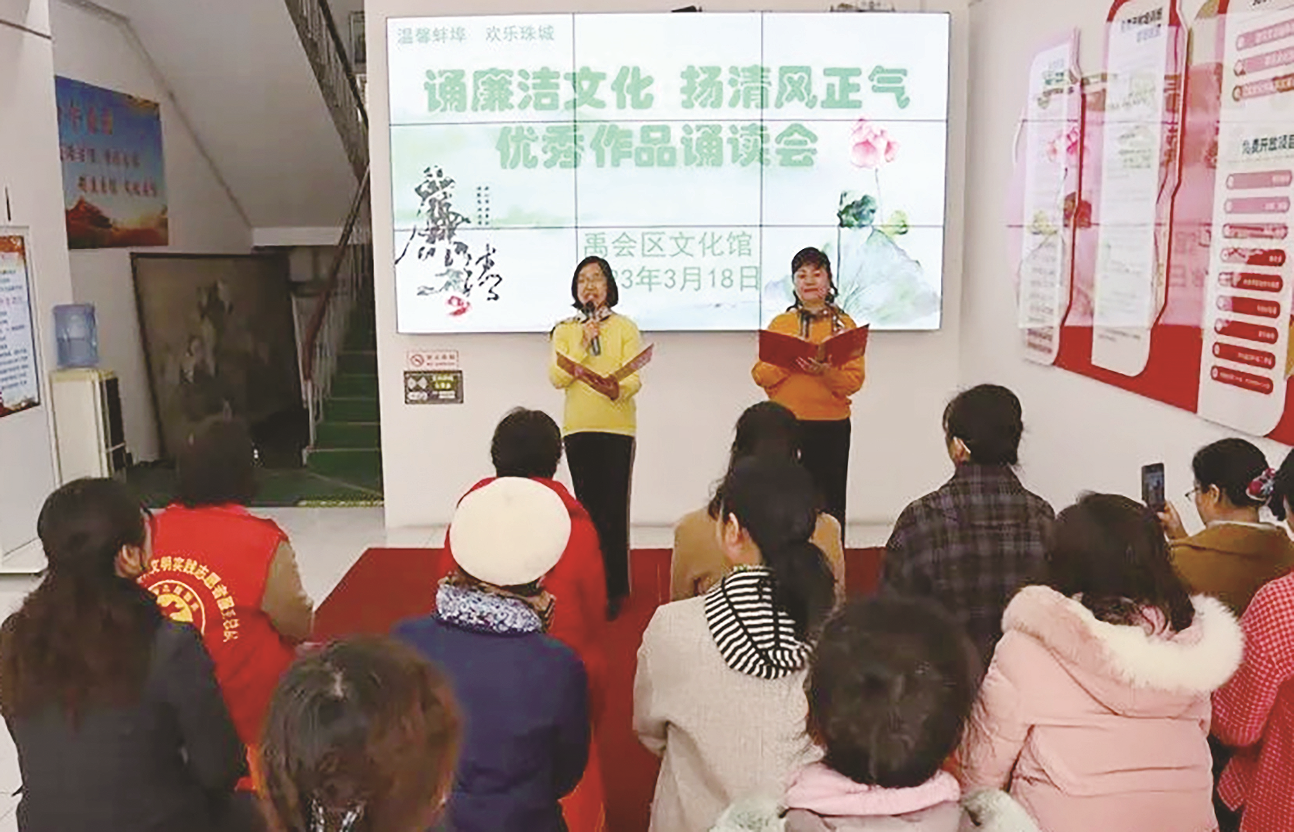 会上,禹会区文化馆朗诵班的学员饱含深情、慷慨激昂地朗诵着一篇篇廉洁优秀作品,使广大群众深刻领悟到“学廉、思廉、践廉”的精神,推动廉洁文化浸润人心,进一步夯实清正廉洁思想根基,营造廉洁自律、清风正气的良好社会氛围。
