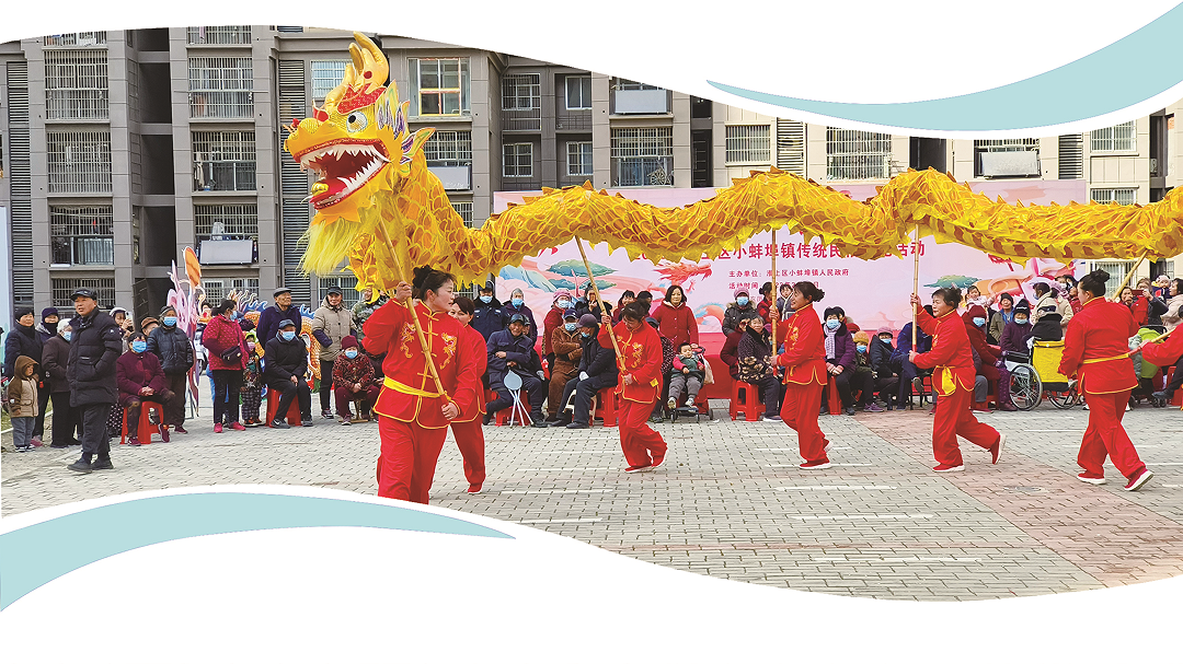 刘艳丽是小蚌埠镇双墩村村民,也是本次舞龙表演的“龙头”,早在六年前就加入了村里自发成立的舞龙队,现在不仅一有活动就积极参加,而且经常组织大家彩排,业余文化生活过得有滋有味,“我就是土生土长的小蚌埠人,能够在家门口给大家带来欢乐,俺打心眼里高兴。”