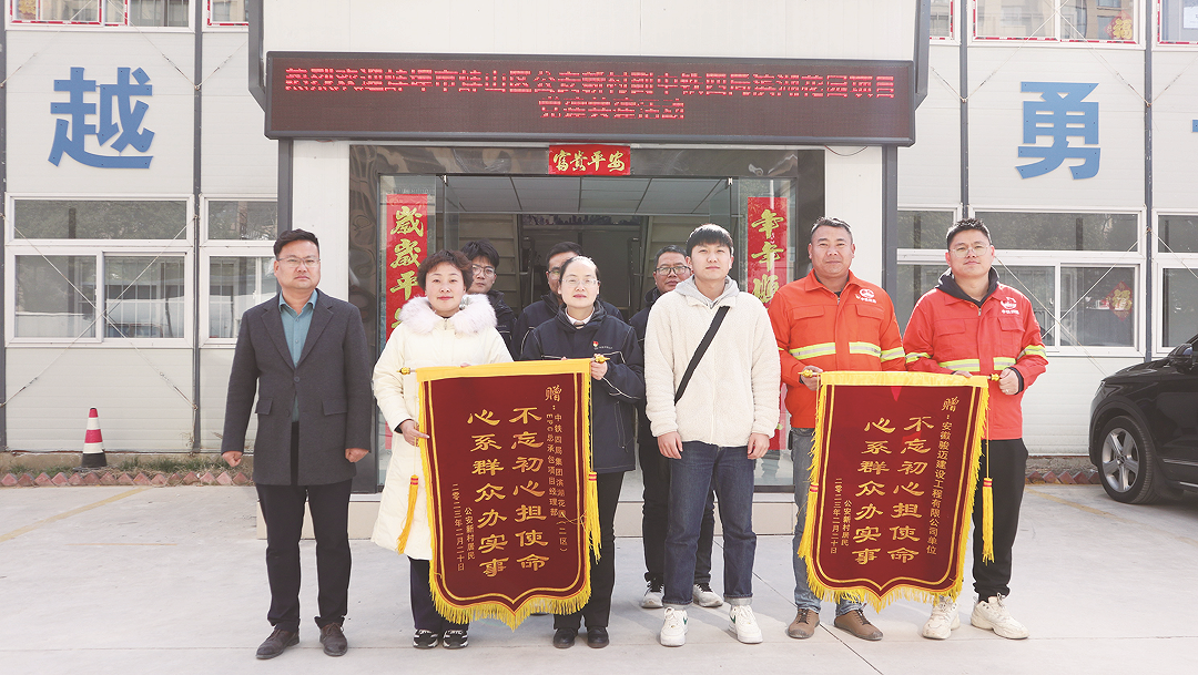 2月21日,蚌山区公安新村居民前往中铁四局一公司蚌埠房建区域经理部,送上两面锦旗,以表达企业为社区居民修路、补刷健身器材的感谢之情。