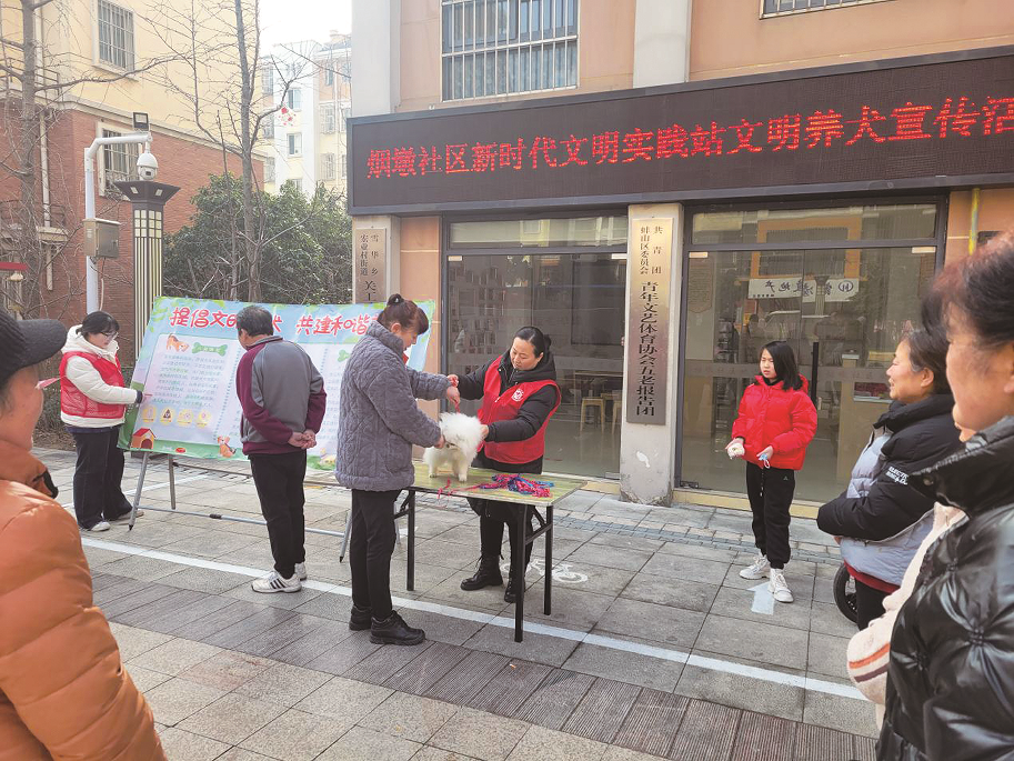 活动中,社区志愿者带领居民深入学习《蚌埠市养犬管理条例》的具体内容,向居民讲解养犬注意事项,例如需要办狗证、出门牵狗绳、定期给宠物打疫苗、宠物粪便及时处理等。