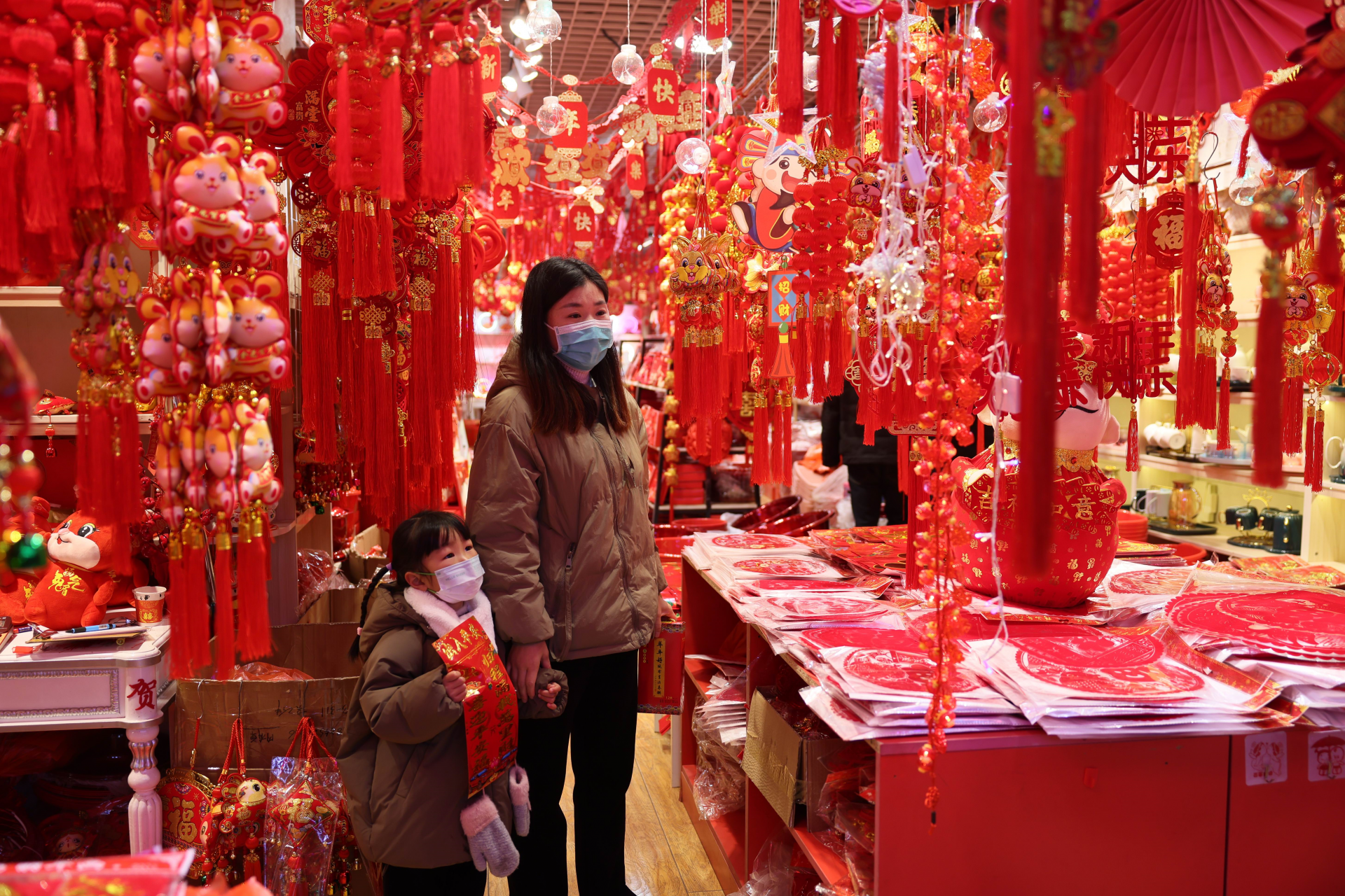随着兔年春节的临近,蚌埠的年味越来越浓,日前,记者看到各种兔元素的造型小景等出现街头,市区各大商超促销商品纷纷上架,各式各样的春联、窗花、挂件等喜庆用品也进入热销期,到处呈现出一片喜庆祥和的节日氛围。