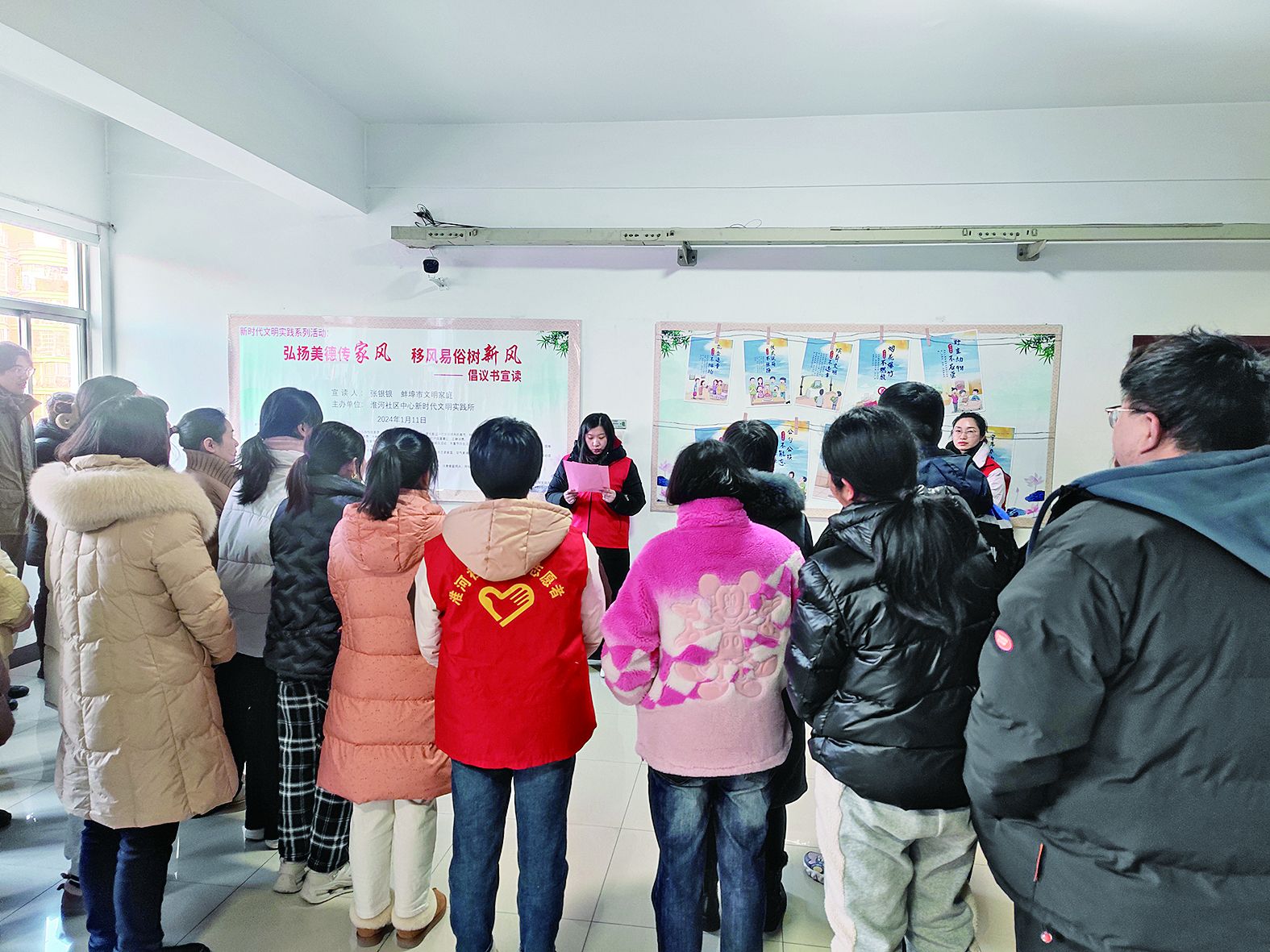 淮河社区中心新时代文明实践所开展“弘扬美德传家风 移风易俗树新风”倡议书宣读活动