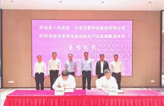 蚌埠发布客户端讯 5月29日,怀远县人民政府与江苏宝馨科技股份有限公司、南京捷登智能环保科技有限公司分别举行6GW高效异质结电池及相关产品高端制造项目、怀远县共享储能电站项目签约仪式。蚌埠市委常委、怀远县委书记王庆武,县委副书记许汉生,县委常委、副县长赵凯,县委常委、常务副县长祖家国,徽商银行蚌埠分行党委书记、行长聂海申,江苏宝馨科技、南京捷登智能环保实控人马伟,江苏宝馨科技股份有限公司总裁左越,江苏宝馨科技股份有限公司总裁高级副总裁张中良,江苏宝馨科技股份有限公司总经理张昕等参加签约仪式。