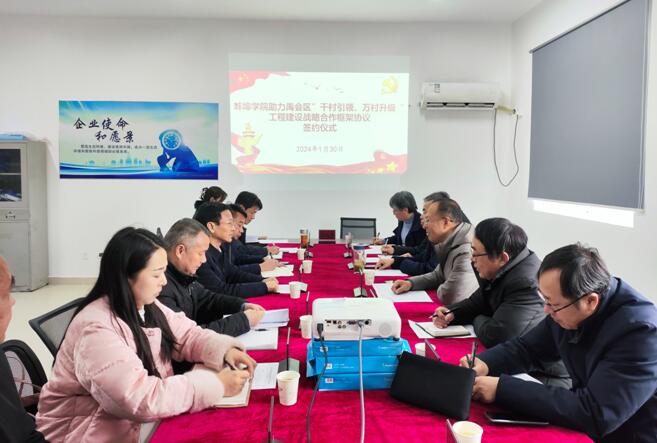 蚌埠发布客户端讯 为进一步加深禹会区和美乡村建设成效,深化交流合作,1月30日,蚌埠学院助力禹会区“千村引领、万村升级”工程建设战略合作框架协议签约仪式在禹会区长青乡涂山村举行,蚌埠学院党委副书记、院长孙艳辉,禹会区委副书记、区长张斌代表双方签字。蚌埠学院相关负责人,禹会区副区长陈春霆、区农业农村水利局局长徐国军,长青乡党委副书记、乡长张震,涂山村、杜郢村党组织负责人及设计单位等出席签约仪式。
