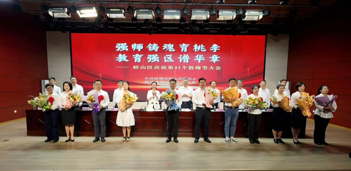 9月9日上午,蚌山区庆祝第41个教师节大会在城南学校报告厅举行。区委书记、区委教育工作领导小组组长桑延慧主持并讲话,市委教育工委书记、市教育局局长刘善训特邀出席,区领导张圣辉、安永民、韩莉、吴军、梅友伟、潘成佳、邵兵、谢庆元及区委教育工作领导小组成员单位主要负责同志,各乡街(社区中心)党(工)委主要负责同志、区属中小学(幼儿园)主要负责同志,受表扬的先进集体和优秀教师代表参加。