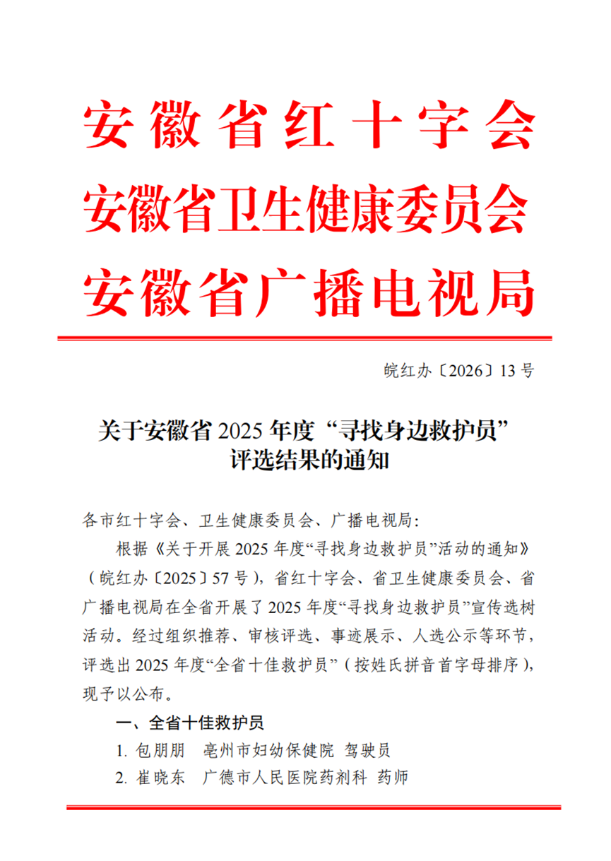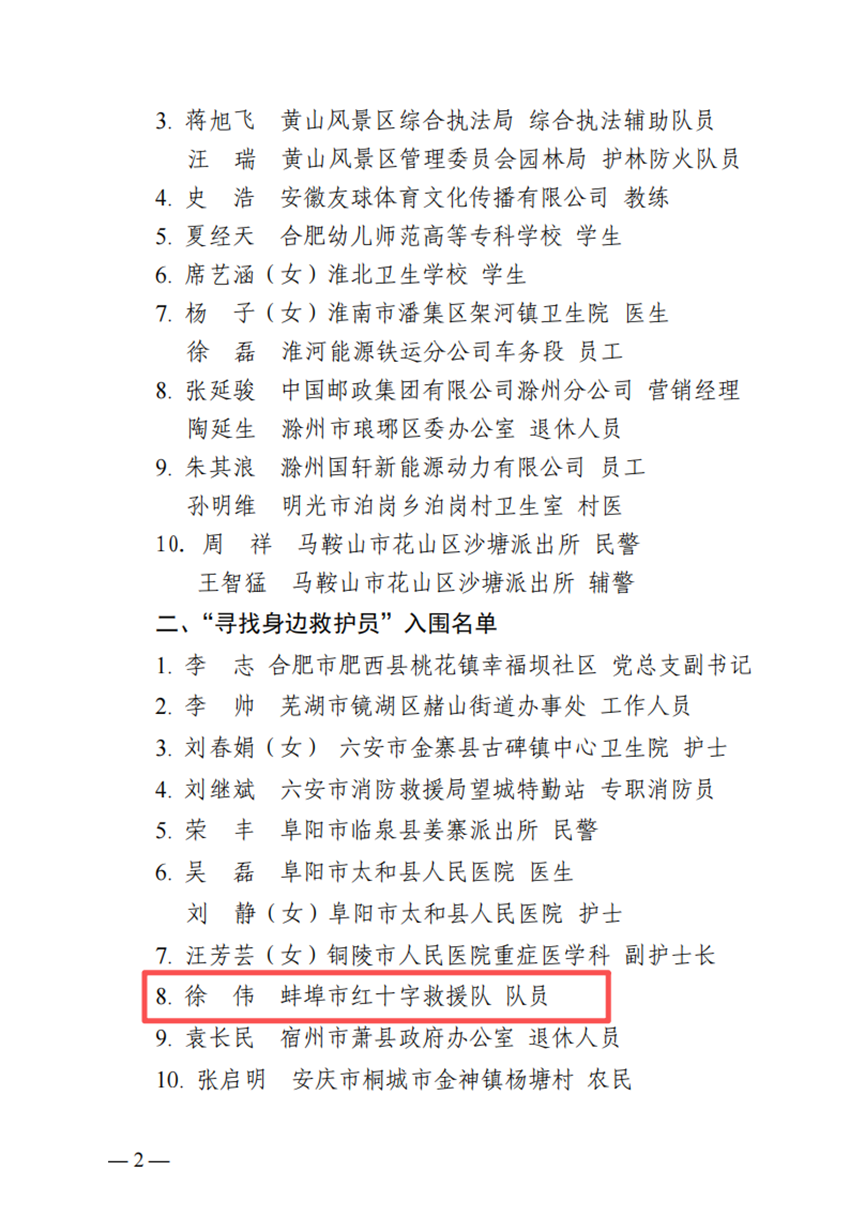 近日,由安徽省红十字会、省卫生健康委、省广播电视局联合主办的2025年度“寻找身边救护员”宣传选树活动公布省级候选人名单,经蚌埠市红十字会推荐上报的市红十字救援队队员徐伟成功入围,成为我市唯一入围的应急救援代表。