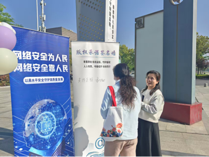 活动现场秩序井然、氛围热烈。在内容宣传展览区,主题宣传展板、创意书签陈列整齐,工作人员向来往市民耐心讲解科学阅读理念、版权保护典型案例、“扫黄打非”工作要点、正版软件与网络安全相关知识,同步发放科普宣传手册,引导群众认清盗版危害、树立正版意识,在沉浸式观展中读懂阅读价值、筑牢安全理念。一旁设置的版权承诺签名墙前,市民们郑重签下名字,主动承诺尊重原创、拒绝盗版,争做版权保护的践行者与宣传者。此次活动共计发放各类主题宣传册200余份,累计吸引50余名市民主动参与版权守护承诺签名。