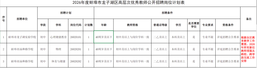 附件1:2026年度蚌埠市龙子湖区高层次优秀教师公开招聘岗位计划表